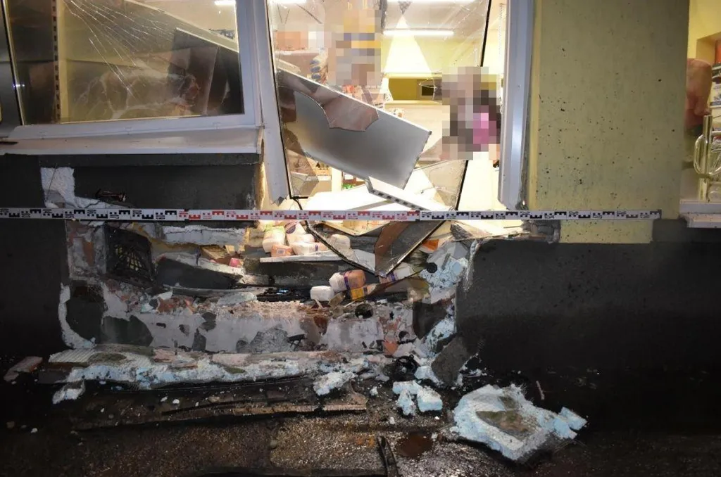 A kocsi vezetője nekihajtott egy élelmiszerüzlet kirakatának, áttörte a falat, és felborította a bent álló polcokat.