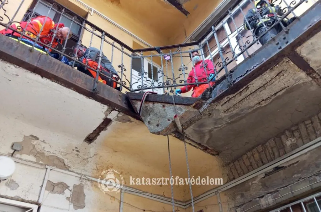 A helyszínre a fővárosi hivatásos tűzoltókat vezényelték, akik előbb kötelekkel biztosították a betondarabot, majd az elemet tartó vasalatot levágták, végül alpin-technika segítségével leengedték a mázsás tömböt.