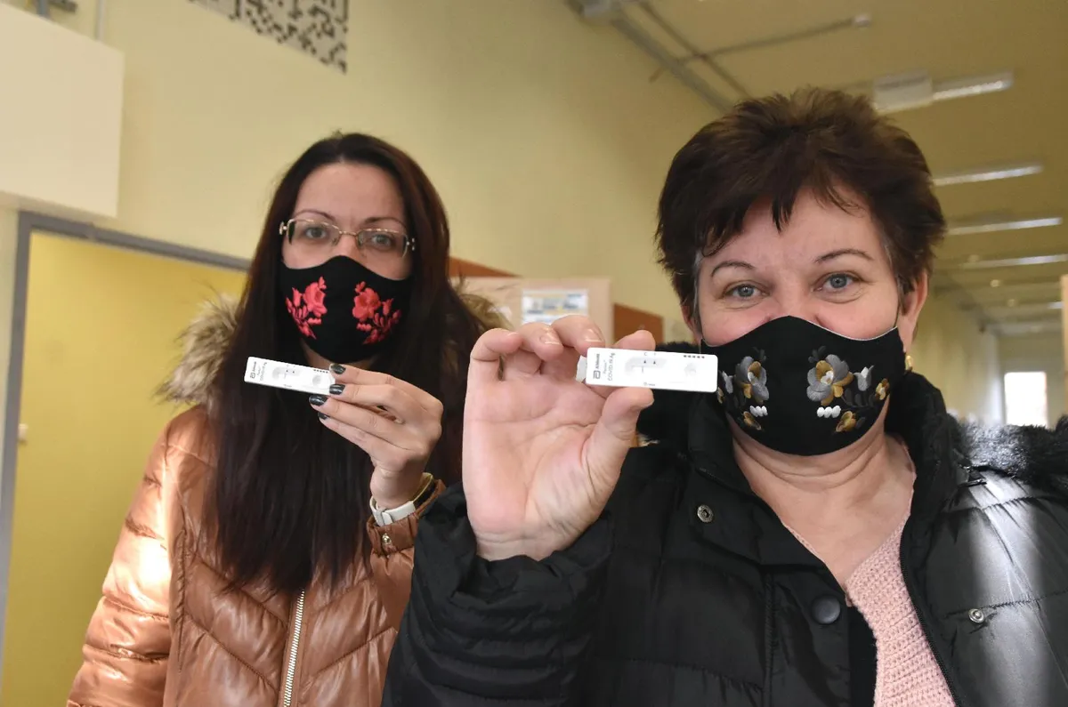 Kovács Nóra dajka és Kovácsné Nagy Gizella óvónő, jászalsószentgyörgyi óvoda dolgozói mutatják negatív koronavírustesztjüket Szolnokon, az Ady Endre úti kormányablakban 2021. január 2-án. MTI/Mészáros János