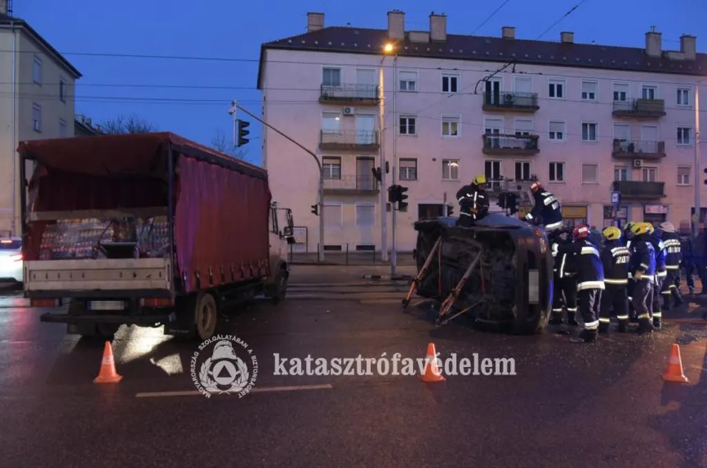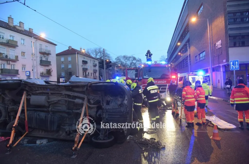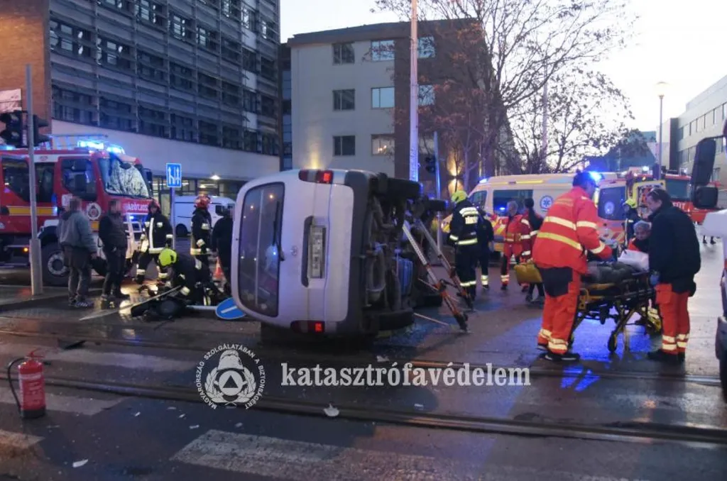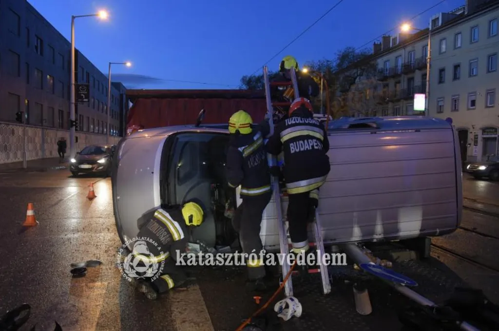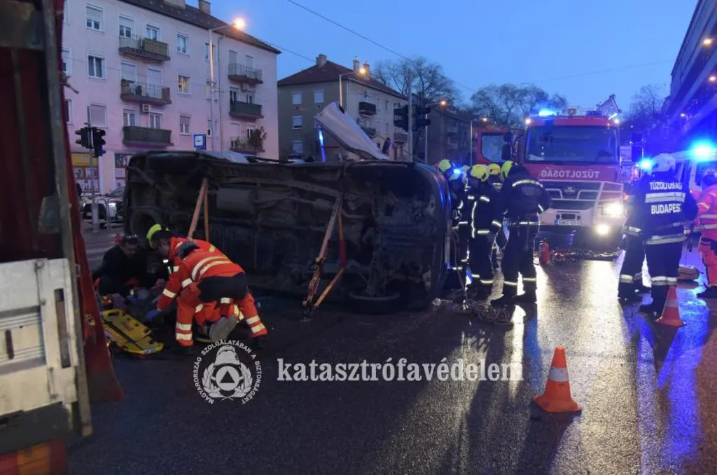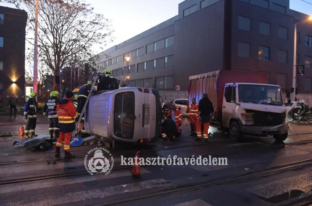 Hatalmas baleset történt szerdán reggel Budapest XI. kerületében, a Fehérvári úton. A Hauszmann Alajos utcai kereszteződésnél összeütközött egy kisteherautó és egy kocsi, utóbbi pedig a villamossínekre borult.