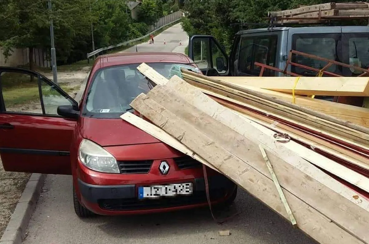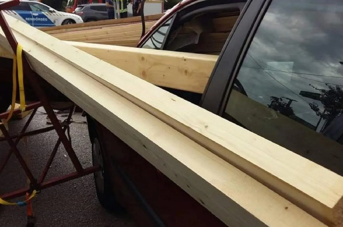 A gerendák a vétlen vezető autójára zúdultak, több darab még az utastérbe is befúródott, miután kiütötték a szélvédőt. A férfi szerencsére csak könnyebben sérült meg.