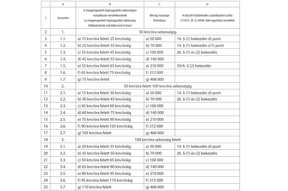 Ebből kiderült, hogy a korábban 30-39 ezer forint legkisebb kiszabható bírság 2024 augusztus közepétől már minimum 50 ezer forint lesz, amit már akár 15-25 kilométeres sebebességtúllépés miatt is kiszabhatnak. A legnagyobb büntetés is hatalmasat ugrik néhány napon belül, a korábbi 390 ezer helyett 468 ezer forintos csekkre számíthatnak a szabálytalan sofőrök.