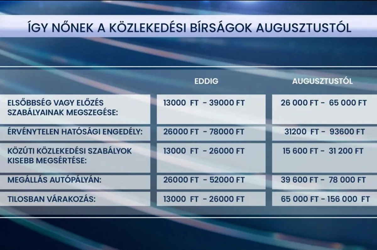 Jelentősen emelkednek egyes közlekedési szabálysértések után a bírságok augusztustól. Szabálytalan előzésért az eddigi 39 ezer forintos büntetés 65 ezerre nő. Aki pedig jogtalanul áll mozgáskorlátozott helyre, az 156 ezer forintos bírságra számíthat, a kocsiban telefonálásért 52 ezer forintot kell majd fizetni, aki pedig megáll az autópályán, 78 ezeres csekket kap majd.