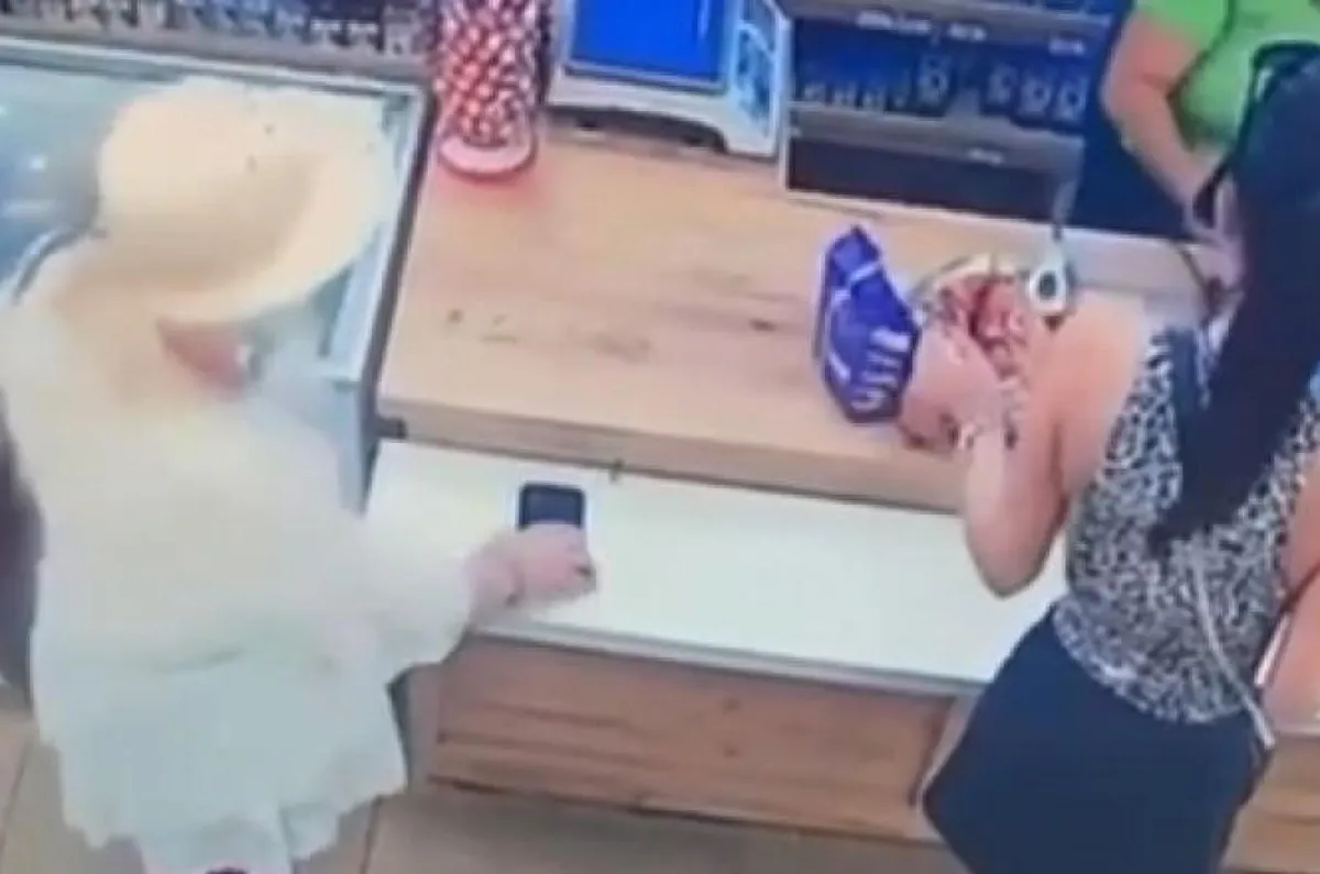 A videón látható, ahogy a nő meglátja a mobiltelefont az üzlet pultján, és elveszi azt.