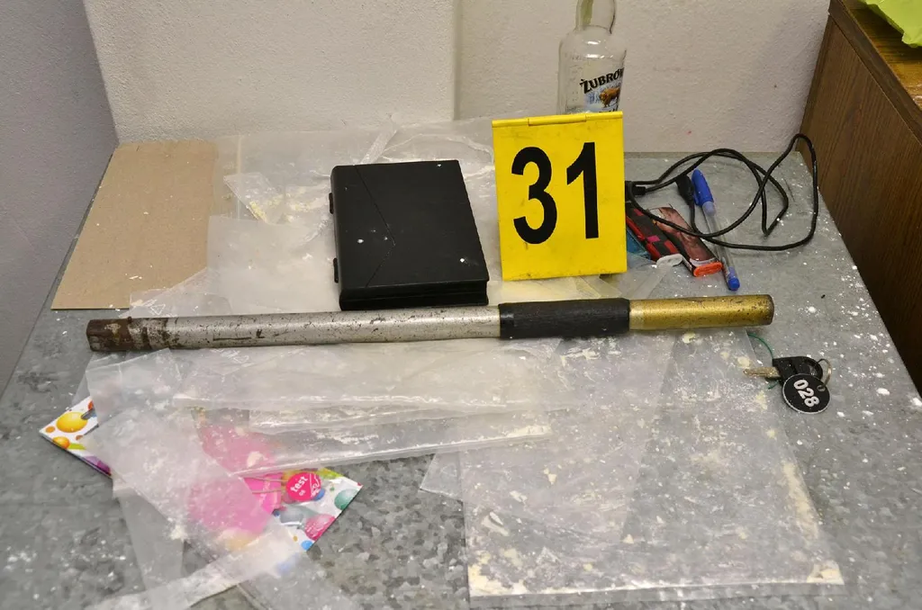 A KR NNI dejtáron megjelenő nyomozóit meglátva, a 49 éves apa az utcára néző ablakon egy 6,7 gramm súlyú fehér port, felhetően kokaint dobott ki, ezen felül 2 darab rózsaszín kábítószergyanús tabletta is volt. Lakhelyén egy üvegben 305 gramm növényi törmeléket, illetve simítózáras zacskót is lefoglaltak a nyomozók.