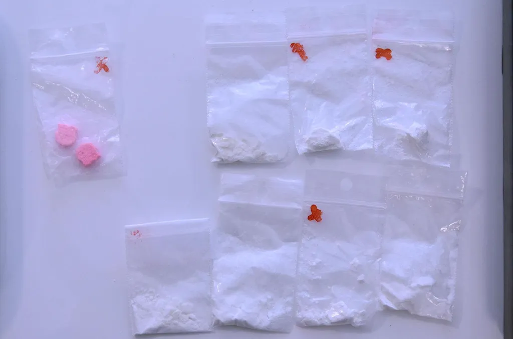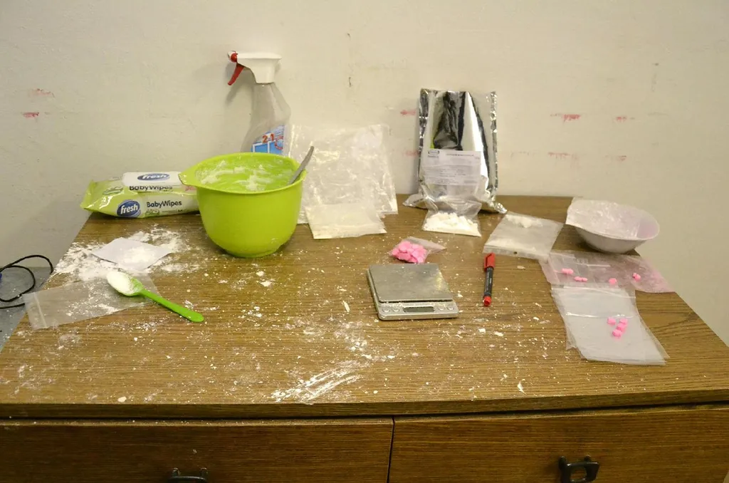 Ezután a férfi garázsában tartott kutatás során nagy mennyiségű, különböző típusú kábítószergyanús anyagot, a kábítószer csomagolásához, hígításához, méréséhez szükséges eszközt foglaltak le a rendőrök. A helyszínen talált 48 gramm súlyú csomagban kokainra, a 60 darab pink színű tablettában MDMA hatóanyagra adott jelzést a gyorsteszt.