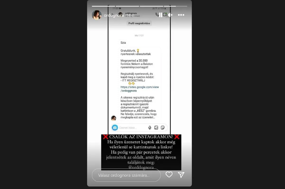 Nemrégiben nyerményjátékot is hirdettek, melynek keretén belül a szerencsés markát egy 30 ezer forint értékű ajándékcsomag üti, Nóra Instagram-oldalán most azonban arra figyelmeztetett, ezzel csalók próbálnak visszaélni.