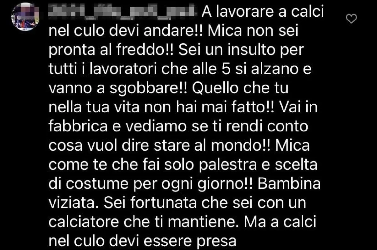 "Egy se**berúgás kellene neked, hogy elmenj dolgozni végre. Egyáltalán nem állsz készen a hidegre!!! Sértés vagy mindazok számára, akik hajnali 5-kor kelnek és gürizni mennek. Amit te soha életedben nem tettél!! Menj el egy gyárba, és majd meglátjuk, mennyire leszel akkor tudatában annak, milyen világban élsz!! Nem csinálsz mást, csak edzeni jársz, és minden napra ruhát választasz magadnak!! Elkényeztetett gyerek. Szerencsés vagy, hogy olyan focista van melletted, aki eltart téged. Egy se**berúgás kellene neked."