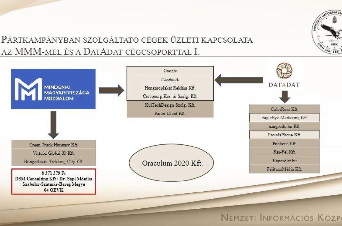 A három vállalkozás kapcsán nem véletlenül állapította meg tehát a Nemzeti Információs Központ, hogy „a beérkező források és a tovább utalások nagyságrendje alapján az MMM, az Oraculum 2020 Kft. és a DatAdat-cégcsoport a külföldről érkező támogatások koordinátorai.”