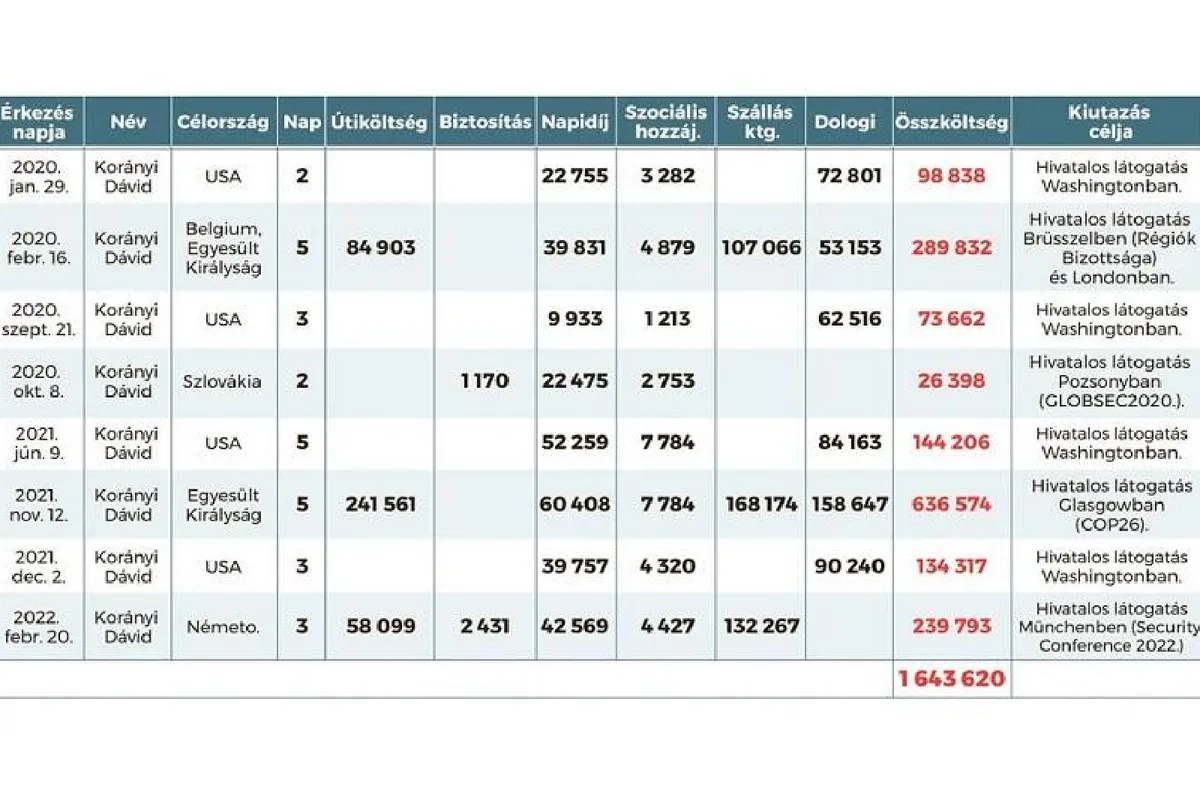 A Korányi hivatalos, elszámolt külföldi utazásait összesítő adatsor szerint Bajnai Gordon korábbi kormányfő és Karácsony Gergely főpolgármester volt tanácsadója nyolc ilyen jellegű látogatáson vett részt. Ezek közül négy Washingtonba irányult, azaz az Action for Democracy révén 2022 elejétől a dollárbaloldal pénzgyűjtését intéző Bajnai-bizalmas minden második hivatalos külföldi útja az Egyesült Államok fővárosába vezetett. Mindemellett Korányi egy brüsszeli és londoni (összevont), egy pozsonyi, egy müncheni és egy glasgow-i útról adott számot. A főtanácsadó USA-beli útjainál útiköltséget nem számolt el, csak dologi költségeket.