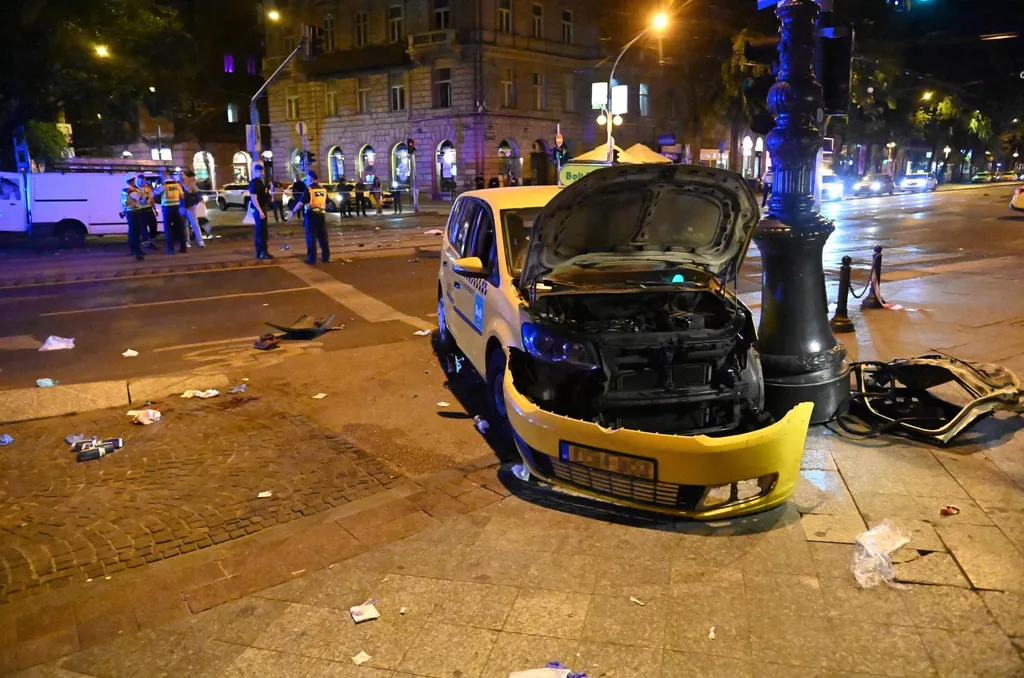 Letarolt egy taxit egy furgon csütörtökön este Budapesten, az Erzsébet körút és a Dohány utca kereszteződésében.