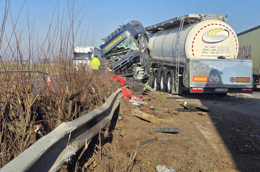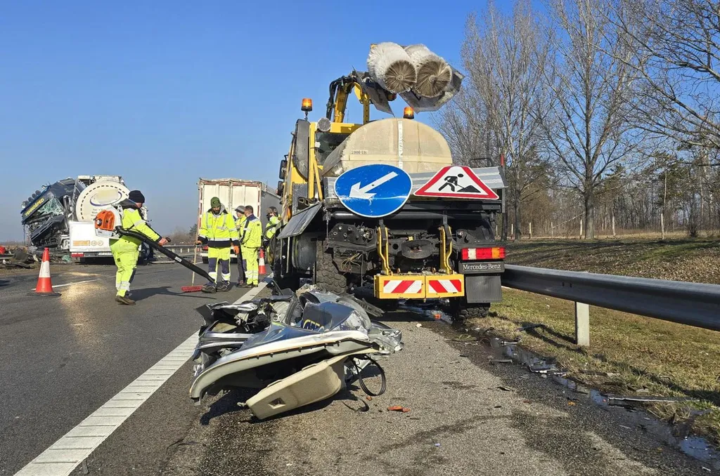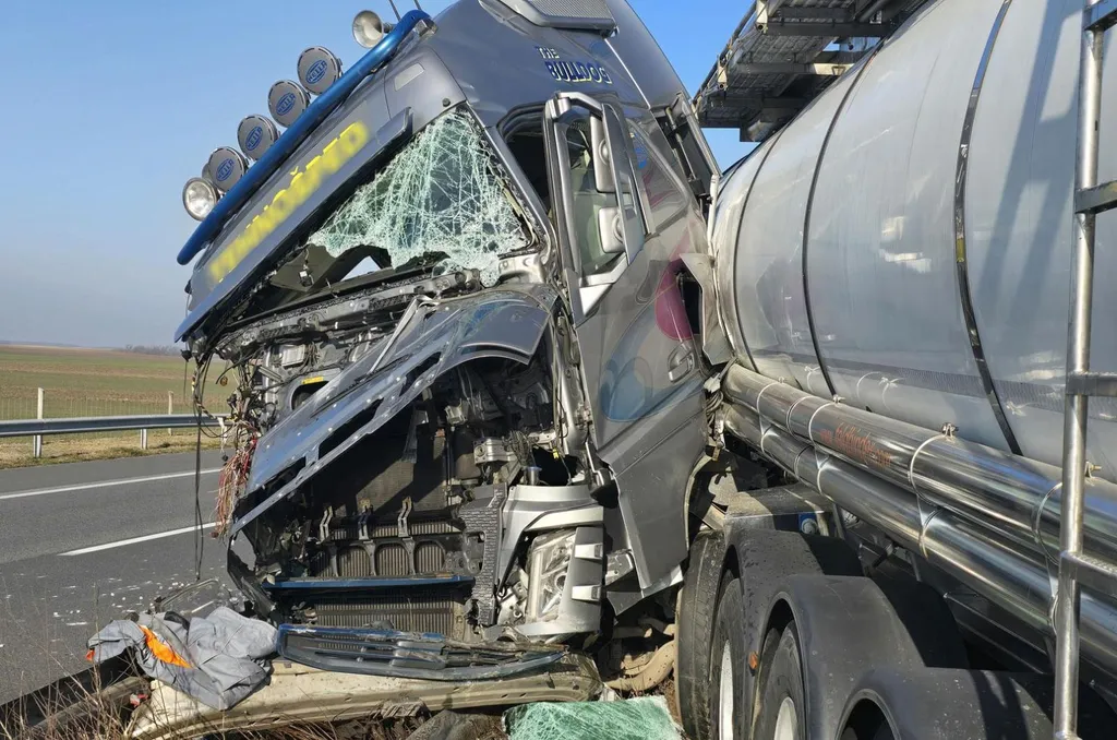 A szerb, bort szállító tartályos kamion Budapest felé haladt, amikor a leállósávban lévő és szalagkorlátot mosó autópálya karbantartó teherautójának csapódott. A kamionos félrerántotta a kormányt, áttért a belső sávba, ahol átszakította a belső szalagkorlátot, majd bebicskázva a másik oldalra átnyúlva állt meg – közölte a Tények tudósítója.