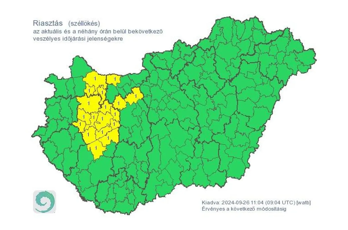 A HungaroMet csütörtökön délelőtt a szél miatt elsőfokú riasztást adott ki Komárom-Esztergom, Győr-Moson-Sopron, Veszprém, Fejér és Somogy vármegye számos járására.
