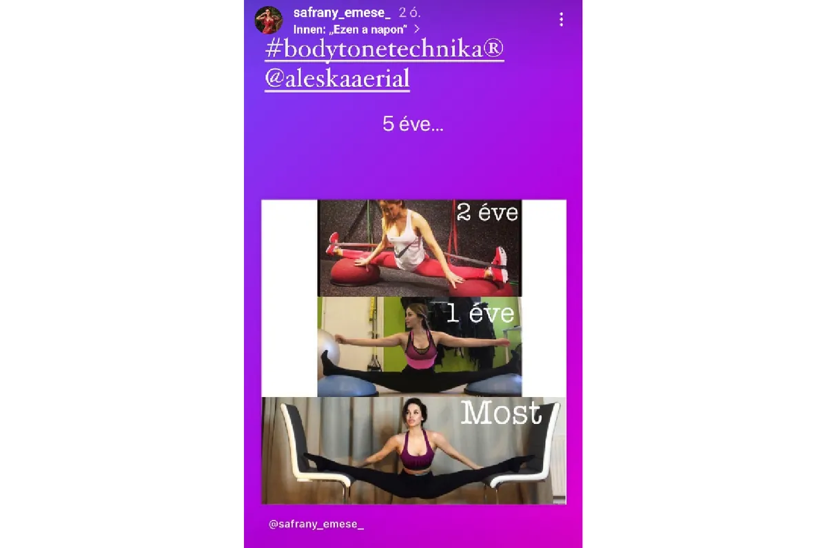 Hétfőn egy 5 évvel ezelőtti emléket osztott meg Instagram-oldalán, melyen a fejlődését dokumentálta. A sportoló a spárgáját hasonlította össze egymást követő 3 éven keresztül.