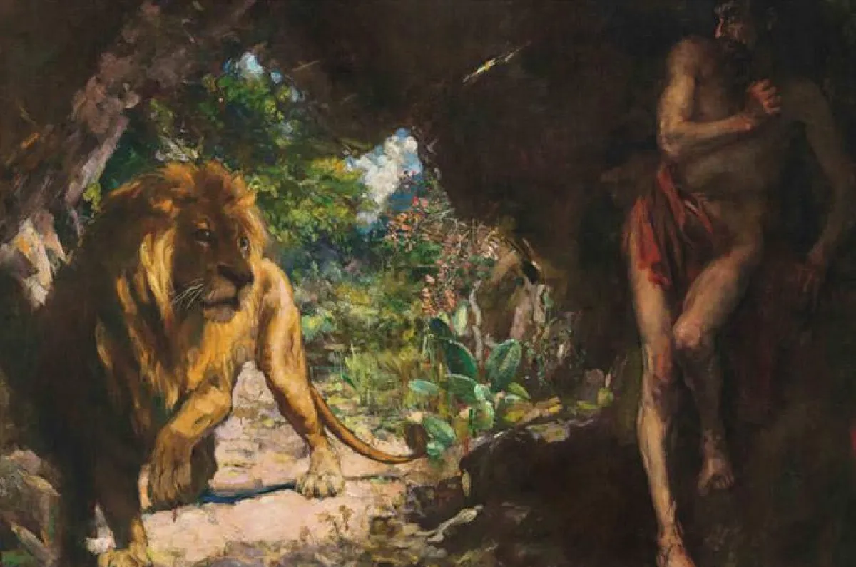 A képen, amelyet a kínai művészettörténet egyik legjelentősebb olajfestményeként tartanak számon, egy barlangban bujdosó rabszolga és egy oroszlán látható. A festmény alapjául szolgáló történet a római mitológiában gyökerezik: egy szökött rabszolgát elfogtak és egy oroszlán elé vetették a Colosseumban, ám a ragadozó nem támadta meg a rabszolgát, mivel az korábban eltávolított egy tüskét az állat mancsából. Végül mindkettőjüket szabadon engedték.