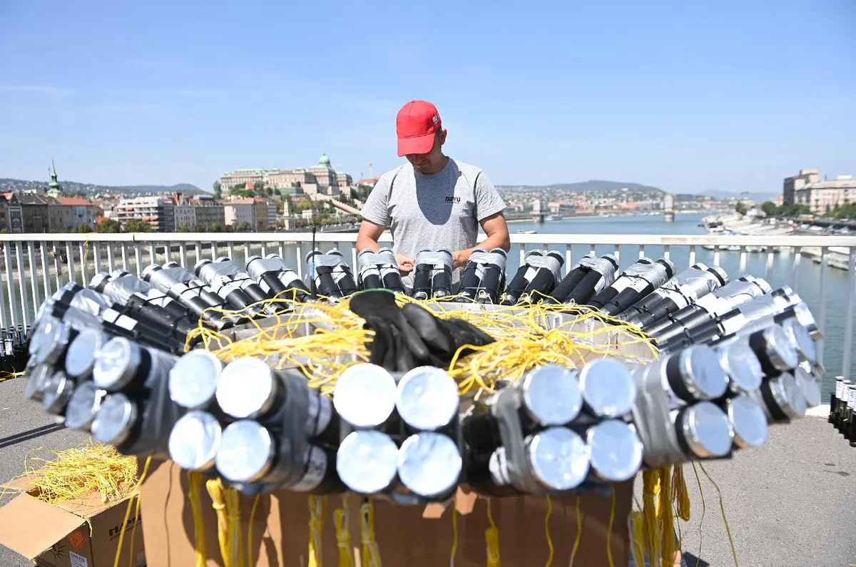 Az augusztus 20-i tűzijáték pirotechnikai eszközeit telepítik a Nuvu Kft. szakemberei az Erzsébet hídon 2022. augusztus 18-án. MTI/Illyés Tibor