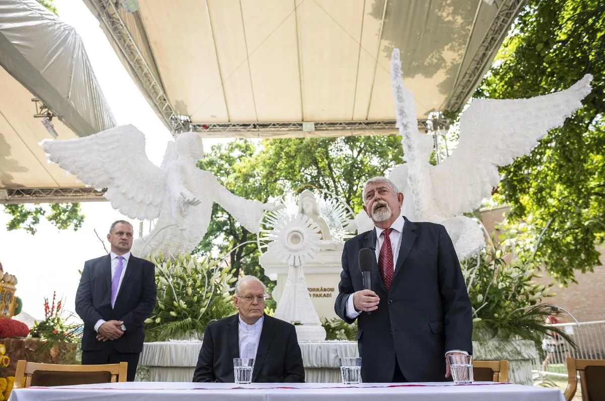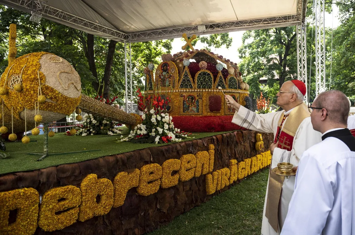 Kitért arra is: a szentségi körmenetekkel a résztvevők Krisztust kérik, hogy védelmezze a plébániát, a várost, az országot, ahol a körmenet elhalad. Ahogy e körmenetek, úgy a Szent Koronát és az oltáriszentséget ábrázoló két virágkocsi is "nagyszerű alakot öltő imádság Debrecentől Esztergomig és Budapestig, hazánkért és egész népünkért" - mondta a bíboros.