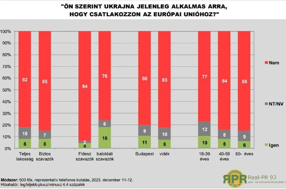 A teljes lakosság négyötöde (82 százaléka), de még a baloldali szavazók háromnegyede (76 százalék) is felkészületlennek tartja keleti szomszédunkat a csatlakozásra – derült ki a Real–PR 93. friss közvélemény-kutatásából, amely rámutat: a magyar lakosságnak szinte egyöntetű a véleménye arról, hogy Ukrajna a jelenlegi állapotában nem alkalmas az Európai Unióhoz való csatlakozásra.