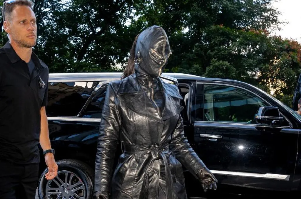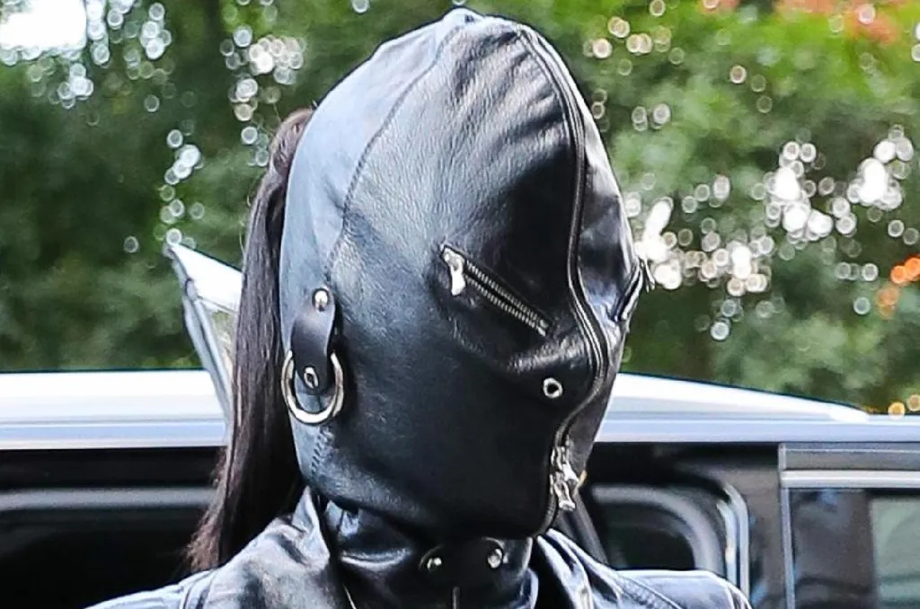 Kim egy bondage stílusú bőrszerkót viselt hosszú bőr csizmával. Ez már önmagában is ütős lenne, de ő még megspékelte azzal, hogy az egész arcát eltakaró bőrmaszkot is felvett. Ez inkább egy fura sisakhoz hasonlít, amelyben az egész feje eltűnik, és csak hosszú lófarokba fogott haja bújik ki belőle hátul. A különleges kiegészítőből, amely meglehetősen hátborzongatóvá teszi az amúgy is extravagáns szettet, a szem magasságban elhelyezett két cipzáron keresztül tudott kilátni.