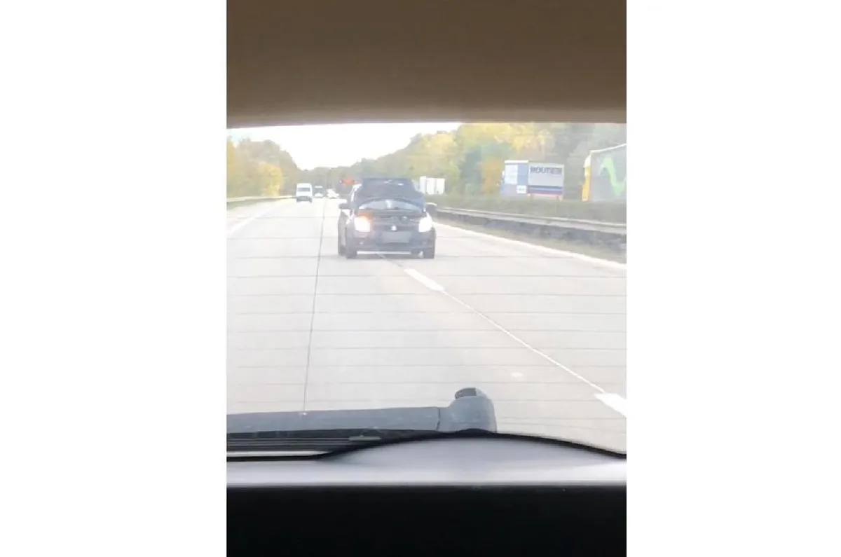 Felnyitott motorháztetővel haladt egy autós az M1-es autópályán, az életveszélyes helyzetben pedig még előzni is próbált. A manőverről a Suzuki előtt haladó autós egyik utasa felvételt is készített, a csütörtökön közzétett videón pedig jól látható, hogy a sofőr legfeljebb a lemez alsó ívének résén láthatott ki, de úgy tűnik, ez egyáltalán nem zavarta.