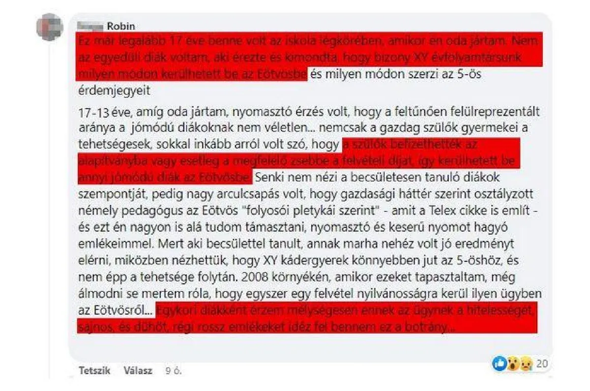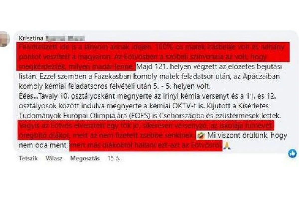 "Tavaly 10. osztályosként megnyerte az Irinyi kémia-versenyt és a 11. és 12. osztályosok között indulva megnyerte a kémiai OKTV-t is. Kijutott a Kísérletes Tudományok Európai Olimpiájára (EOES) is Csehországba és ezüstérmesek lettek. Vagyis az Eötvös elvesztett egy tök jó, sikeresen versenyzőt, az iskolája hírnevét öregbítő diákot, mert az nem fizetett zsebbe senkinek. Mi viszont örülünk, hogy nem oda ment, mert más diákoktól hallani ezt-azt az Eötvösről” – írta a megdöbbentő sorokat egy édesanya.