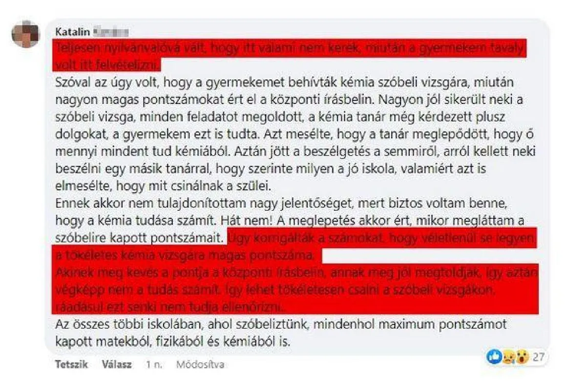 „Teljesen nyilvánvalóvá vált, hogy itt valami nem kerek, miután a gyermekem tavaly volt itt felvételizni” – kezdte a történetét – ugyancsak a Facebookon – egy édesanya, akinek a gyermekét azután hívták be kémia szóbeli vizsgára, hogy nagyon magas pontszámokat ért el a központi írásbelin.