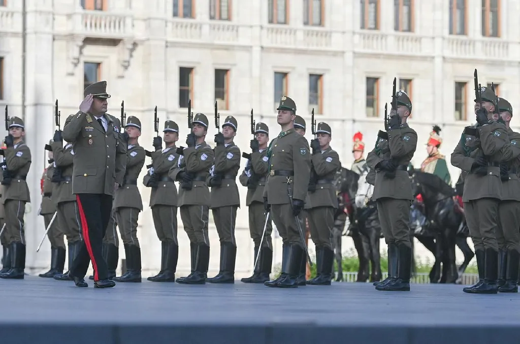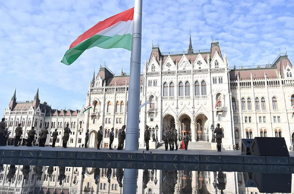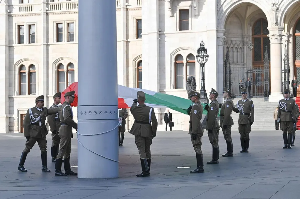 Katonai tiszteletadással, Kövér László, az Országgyűlés elnöke jelenlétében felvonták a nemzeti lobogót az 1956-os forradalom és szabadságharc 67. évfordulóján, hétfő délelőtt Budapesten, az Országház előtti Kossuth Lajos téren.