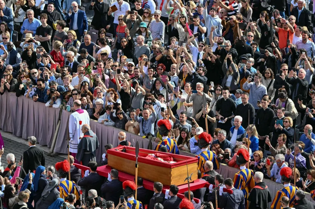 A sorba a Szent Péter téren lehetett beállni, ahova csak többszörös biztonsági ellenőrzés után lehetett eljutni. A bazilikába a jubileumra megnyitott szent kapun lehet bejutni, a pápa nyitott koporsója a főoltár előtt áll. A 11 órai kezdésre mintegy 20 ezren gyűltek össze a téren: egyháziak és gyerekes családok, rómaiak és zászlókat lengető argentinok. Többen rosszul lettek a melegben, rajtuk a tér közelében állomásozó mentősök segítettek – adta hírül az MTI.