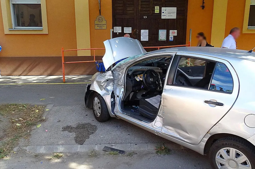 Fotók érkeztek, óvoda bejáratába lökte a villamos az autó Hódmezővásárhelyen