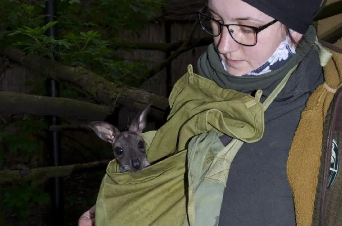 Nem sokkal azután azonban, hogy a kölyök felcseperedett annyira, hogy kidugja fejét anyja erszényéből a nőstény megbetegedett és elpusztult. A kölyök már elég nagy volt ahhoz, hogy gondozója átvegye az anya szerepét, és megpróbálja felnevelni. Azóta már eltelt több mint két hónap, és kiderült, a gondozó fáradozásai eredménnyel jártak, a kis kenguru szépen cseperedik a mesterséges erszényben. Ebben tart nevelőszülőjével annak napi munkája során, időnként kikandikálva, vajon mi történik a külvilágban.