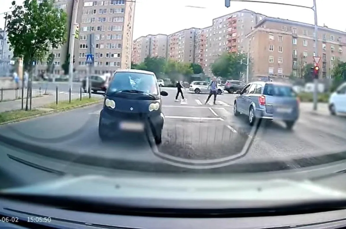 Az első, június 2-ai Papp Károly utca és a Róbert Károly körút sarkán készült videóban az látható, hogy egy Smart a Róbert Károly körútról kanyarodott a Papp Károly utcára, de nem bírta kivárni a gyalogost, ezért elindult, kicsit meg is lökte őt, majd tovább hajtva ordibált kifelé az ablakból. Eközben pillanatokon múlott, hogy nem ment neki a felvételt beküldő autónak.