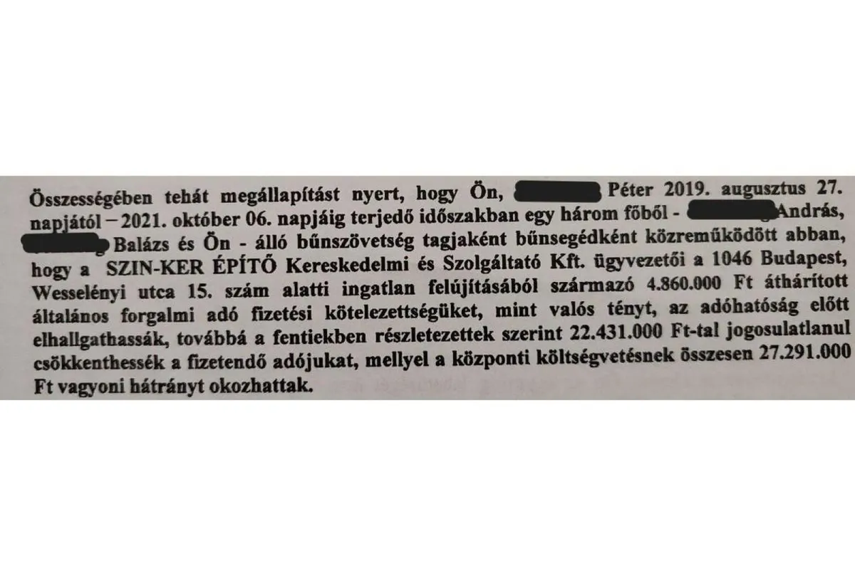 "Összességében tehát megállapítást nyert, hogy Ön, M. Péter 2019. augusztus 27. napjától – 2021. október 06. napjáig terjedő időszakban egy három főből – Sch. András, Sch Balázs és Ön – álló bűnszövetség tagjaként bűnsegédként közreműködött abban, hogy a SZIN-KER Építő Kereskedelmi és Szolgáltató Kft. ügyvezetői a 1046 Budapest, Wesselényi utca 15 szám alatti ingatlan – Tripponék háza - felújításából származó 4.860.000,-Ft áthárított általános forgalmi adó fizetési kötelezettségüket, mint valós tényt, az adóhatóság előtt elhallgassák, továbbá a fentiekben részletezettek szerint 22.431.000 Ft-tal jogososulatlanul csökkenthessék a fizetendő adójukat, mellyel a központi költségvetésnek összesen 27.291.000,-Ft vagyoni hátrányt okozhattak."