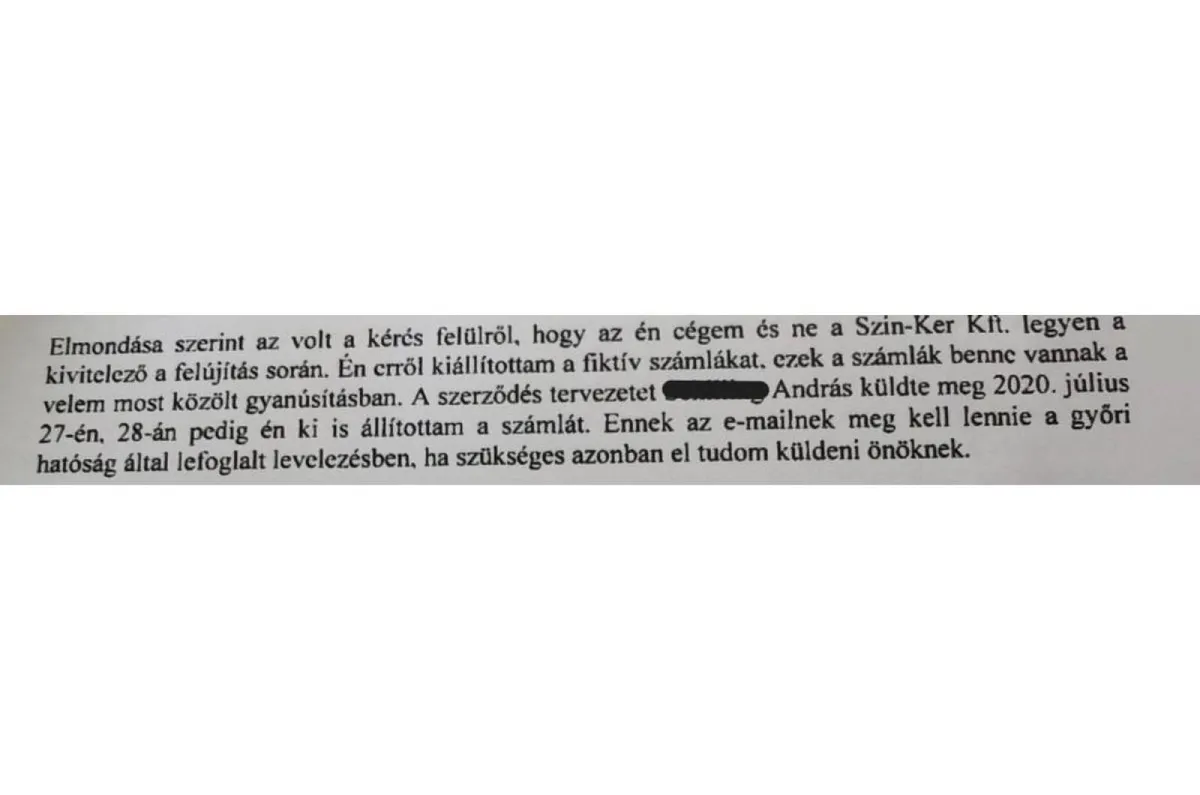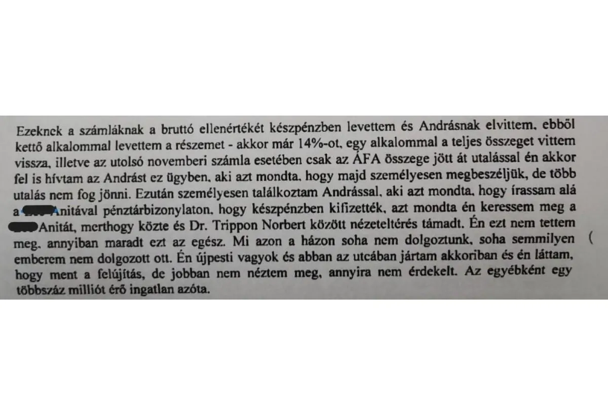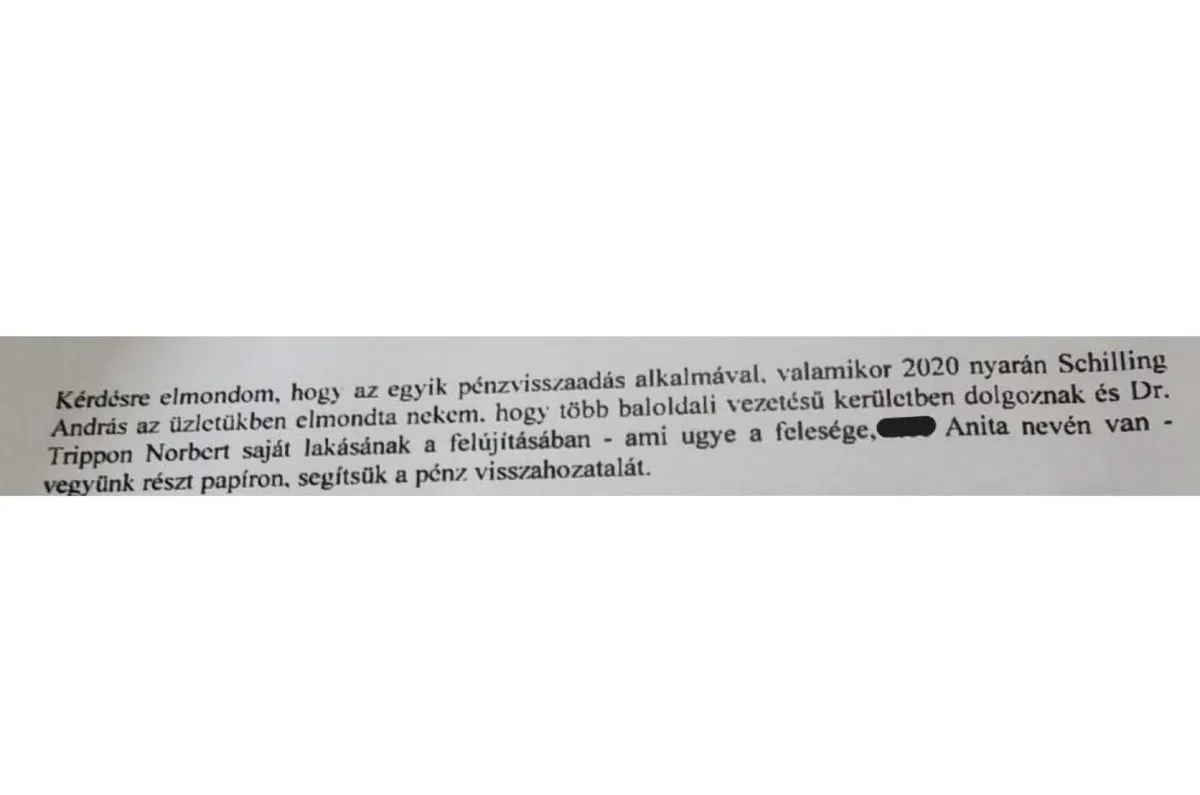 "Egyik pénzvisszaadás alkalmával, valamikor 2020 nyarán Sch. András- SZIN-KER ügyvezetője - az üzletükben elmondta nekem, hogy több baloldali vezetésű kerületben dolgoznak és Dr. Trippon Norbert saját lakásának a felújításában – ami ugye a felesége, L. Anita nevén van – vegyünk részt papíron, segítsük a pénz visszahozatalát.”