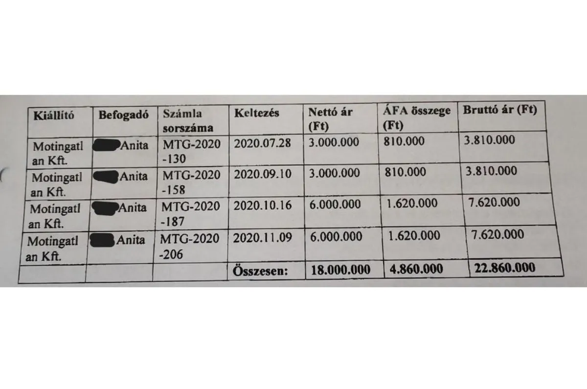 A laphoz kiszivárgott dokumentumból az is kiderült, hogy M. Péter, a Motingatlan Kft. nevében 4 darab fiktív számlát állított ki nettó 18.000.000, bruttó 22.860.000,-Ft értékben, amelyet Trippon Norbert felesége befogadott.