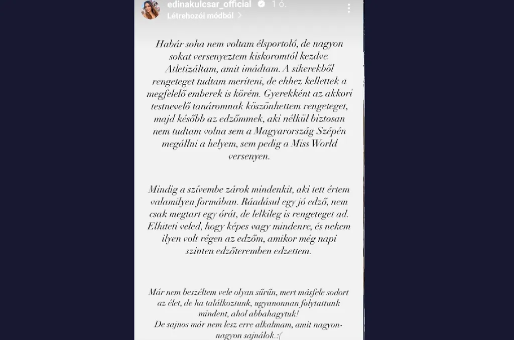 A hír Kulcsár Edinát is megrázta, ugyanis a Magyarország Szépe és a Miss World szépségversenyekre a nagymúltú edző készítette fel.