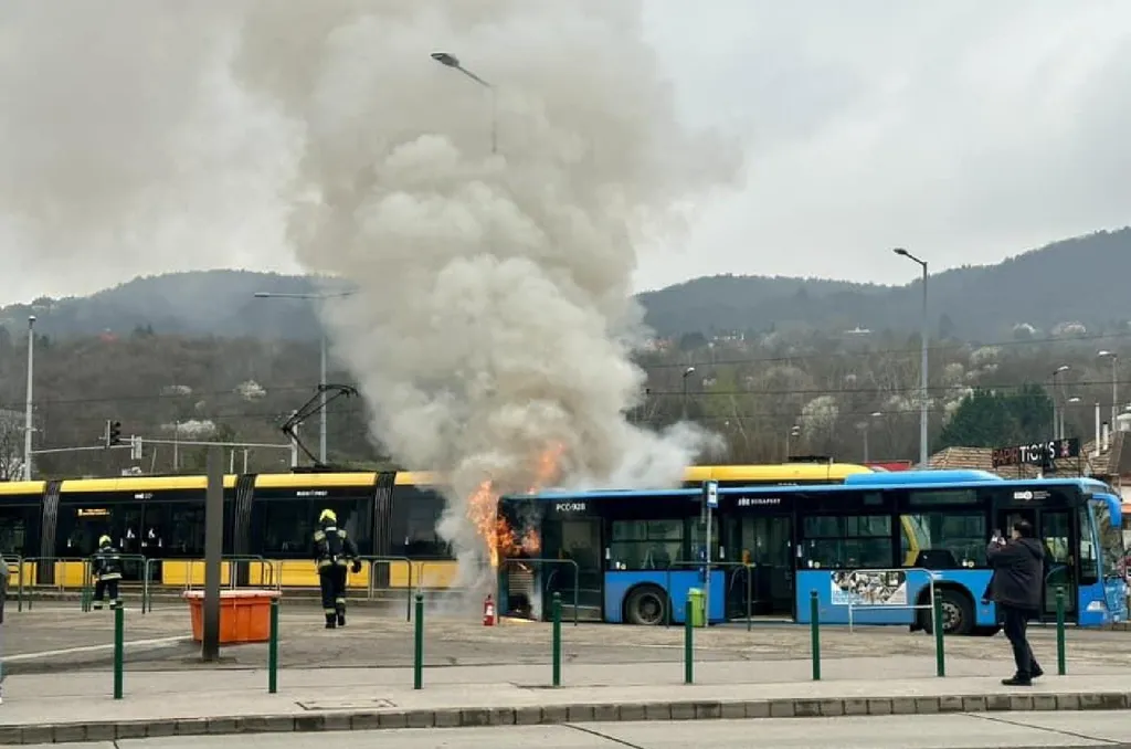 Bécsi út/Vörösvári út. Pár perccel később a busz már lángolt, a tűzoltók, mentők kint vannak. A rendőrök lezárták az utat