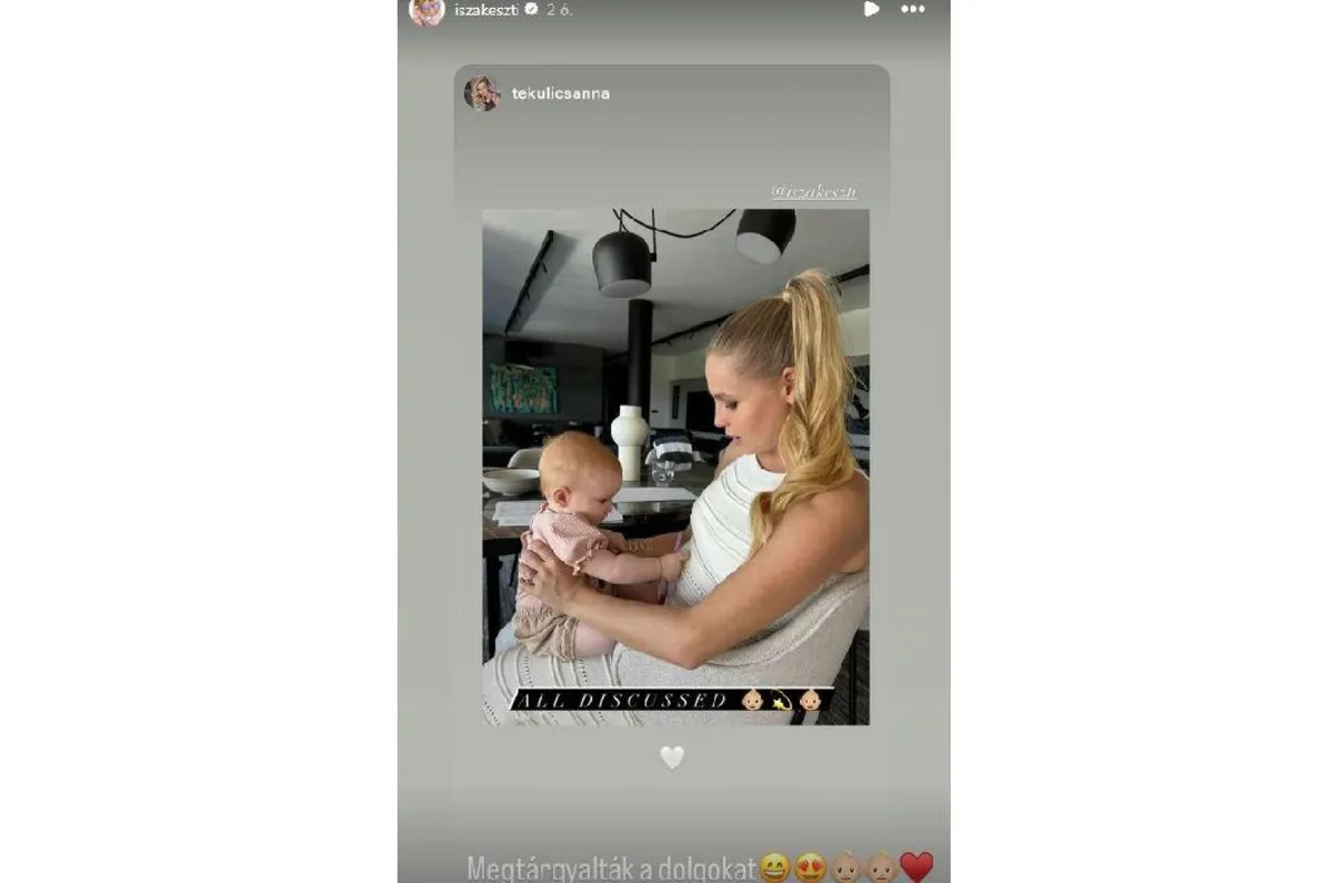A bájos kismama a minap barátnőjénél járt, akinek gyermekét egyből az ölébe kapta. A kicsiről és Esztiről elbűvölő pillanatkép készült, amelyet a Mokka házigazdája 24 óráig elérhető Instagram-sztorijában tett közzé.