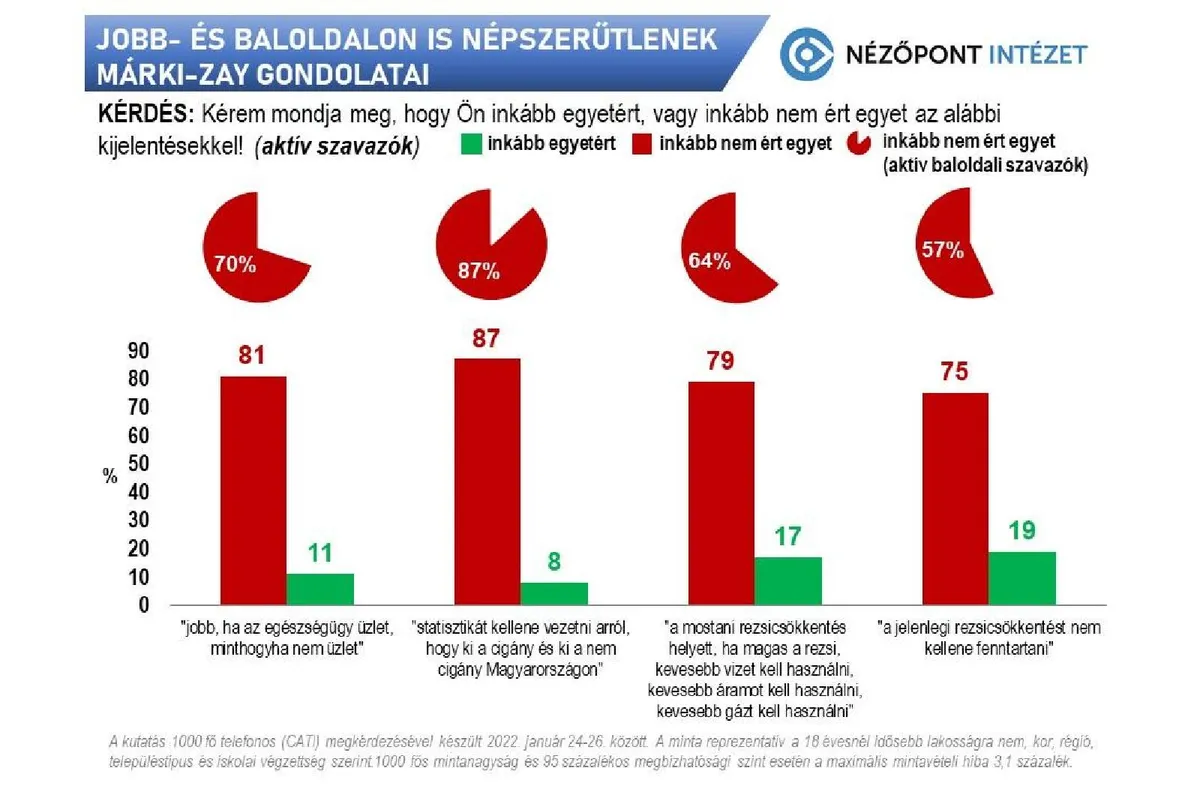 Az aktív szavazók négyötöde (81 százalék) azzal sem ért egyet, hogy „jobb, ha az egészségügy üzlet, minthogyha nem üzlet”[4] (11 százalék egyetért). Tízből hét (70 százalék) baloldali választó is elutasító Márki-Zay Péter kijelentésével kapcsolatban, s mindössze a válaszadók 17 százaléka jelezte, hogy egyetért a kijelentéssel. A kormánypártok szavazóinak 90 százaléka is elutasítja, hogy az egészségügy üzlet (6 százalék egyetért).