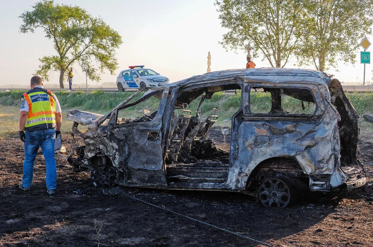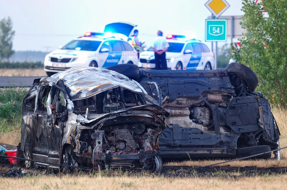 Két ember meghalt, kilenc megsérült, amikor az őket szállító jármű karambolozott, majd kigyulladt Bócsa külterületén péntek 2 óra körül.