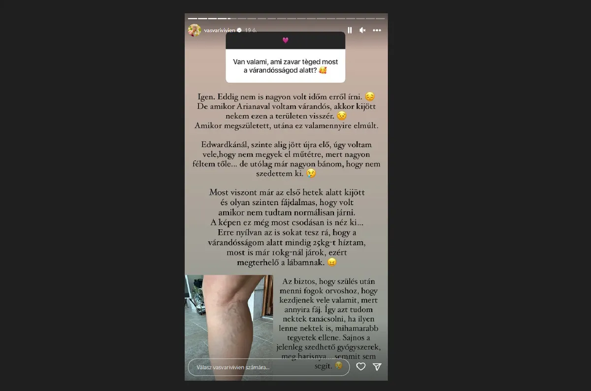 Mint kiderült, a kismamát sem kímélik a visszerek, nagyon nehezen viseli ezeket. Elmondása szerint annyira fájnak a lábai, hogy van olyan nap, amikor nem tud „normálisan járni”. Erre még egy lapáttal rátesz az is, hogy eddig 10 kilót szedett fel terhessége alatt.