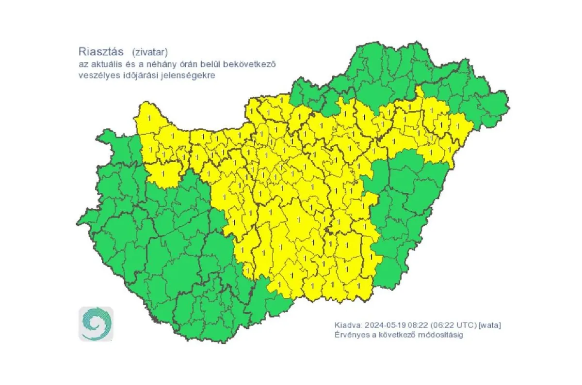 A HungaroMet vasárnap reggel elsőfokú riasztást adott ki egész Komárom-Esztergom, Pest és Csongrád-Csanád vármegyére, valamint Győr-Moson-Sopron, Veszprém, Fejér, Tolna, Bács-Kiskun, Békés, Jász-Nagykun-Szolnok, Hajdú-Bihar, Borsod-Abaúj-Zemplén, Heves és Nógrád vármegye több járására.