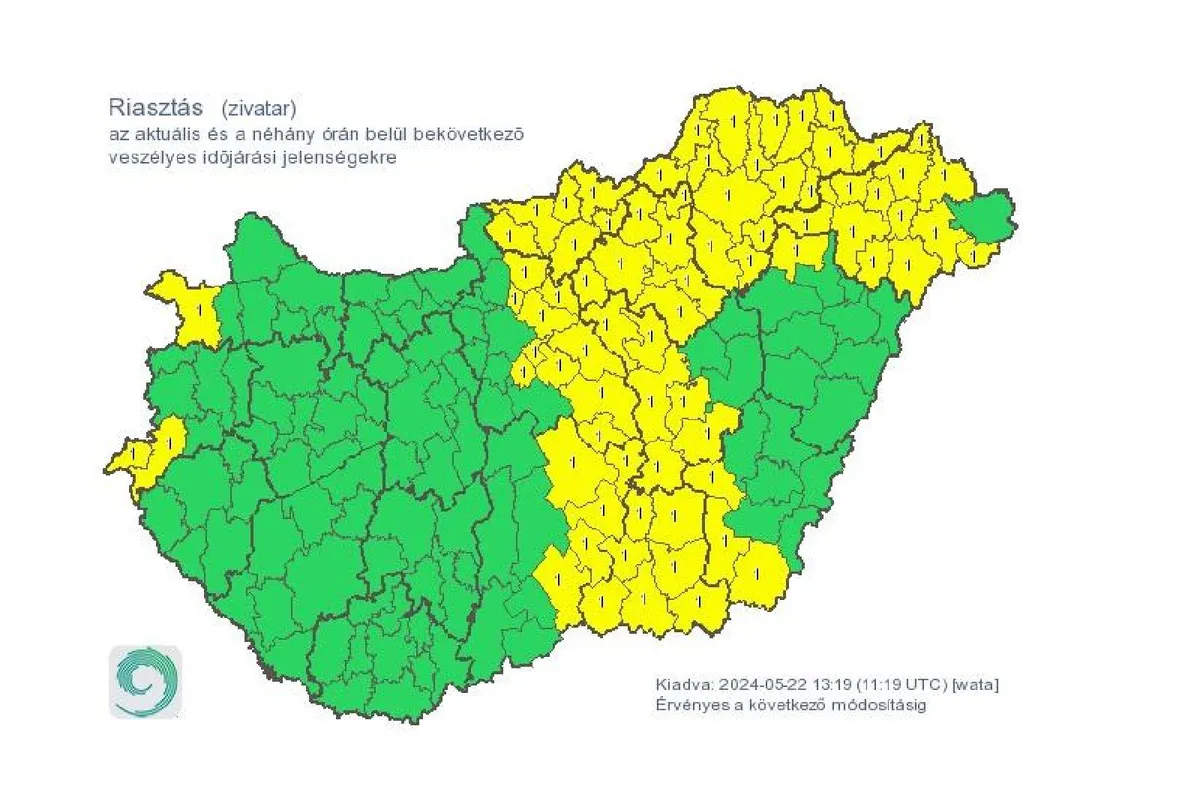 A HungaroMet zivatar miatt elsőfokú riasztást adott ki Nógrád, Borsod-Abaúj-Zemplén és Csongrád-Csanád vármegye teljes területére, illetve Szabolcs-Szatmár-Bereg, Hajdú-Bihar, Békés, Jász-Nagykun-Szolnok, Bács-Kiskun, Pest, Győr-Moson-Sopron és Vas vármegye több járására.