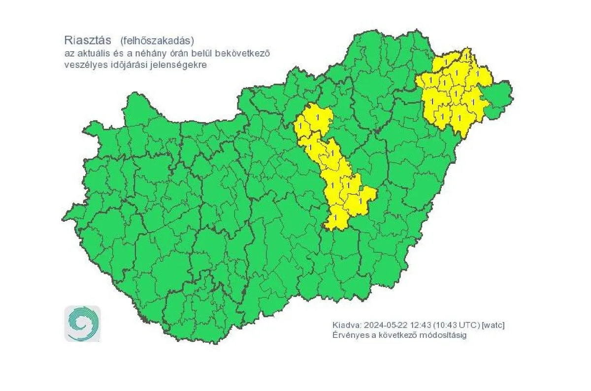 Ugyancsak elsőfokú riasztást adtak ki felhőszakadás miatt szinte egész Szabolcs-Szatmár-Beregre, emellett a Cigándi, a Gyöngyösi, a Hatvani, a Jászberényi, a Jászapáti, a Szolnoki, a Törökszentmiklósi, a Mezőtúri, valamint a Kunszentmártoni járásra.