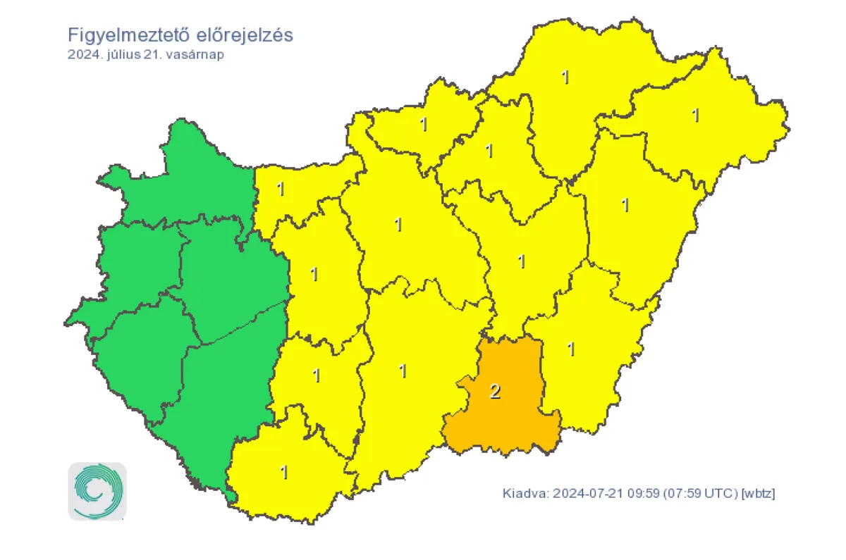 A HungaroMet ráadásul vasárnap elsőfokú, citromsárga riasztást adott ki felhőszakadások és heves zivatarok veszélye miatt.