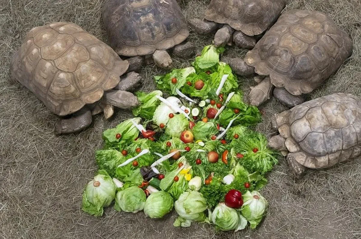 Zöldségekből összeállított, karácsonyfát mintázó csemegéjüket eszik sarkantyús teknősök.