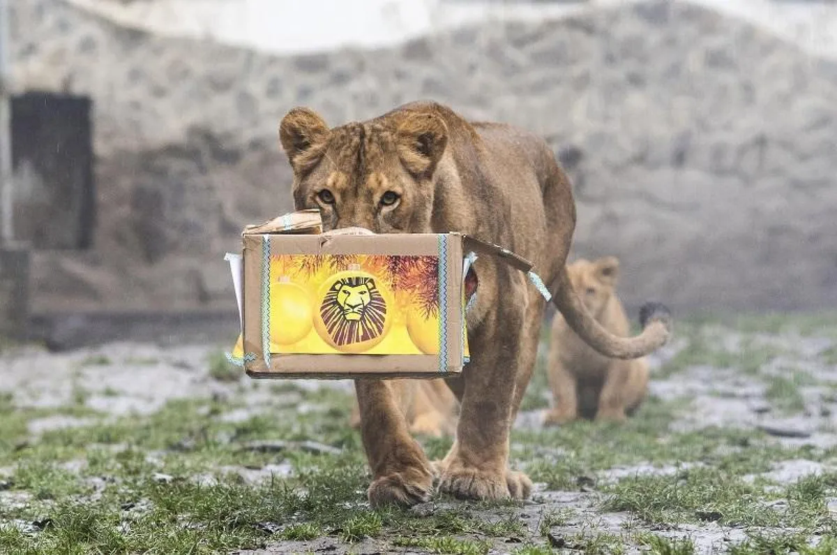 Karácsonyi díszdobozba rejtett napi húsadagját bontja ki egy nőstény afrikai oroszlán (Panthera leo) a Nyíregyházi Állatparkban.