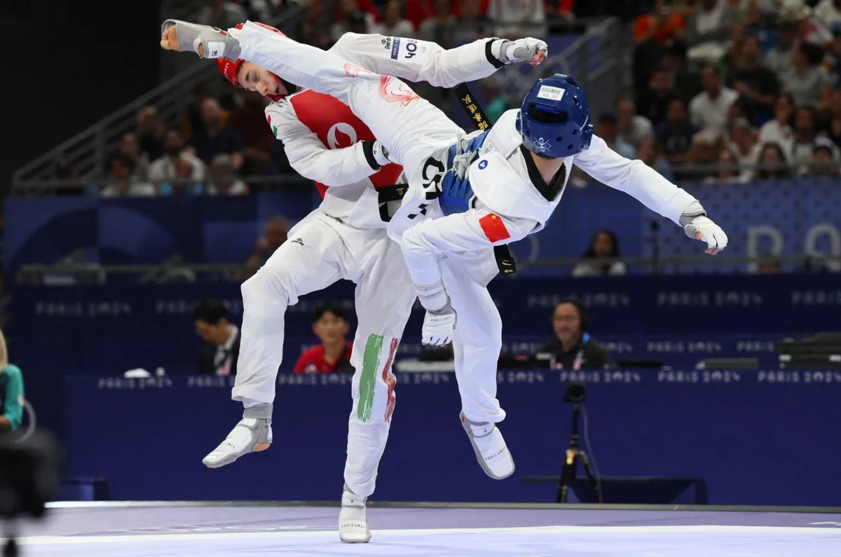 Az olimpia talán legimpozánsabb helyszínén, a vívók korábbi otthonában, a Nagy Palotában kialakított küzdőtéren egy testre rúgással a magyar kapta az első pontokat (2-0), riválisa ugyanezzel a technikával egyenlített (2-2).