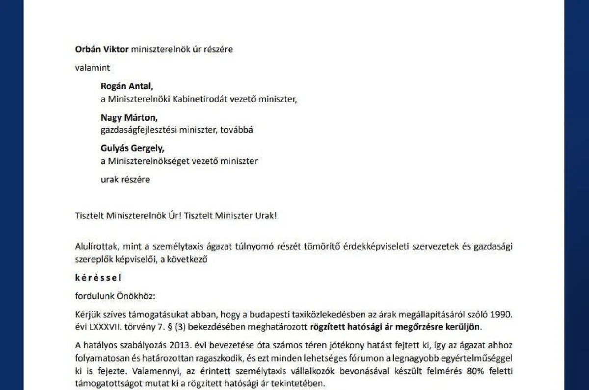 Ebben a taxisok határozott kéréssel fordultak a miniszterelnökhöz: azt szeretnék elérni, hogy a kormány támogassa az ágazatot abban, hogy a budapesti taxiközlekedésben az árak megállapításáról szóló törvényben meghatározott hatósági ár megmaradjon.