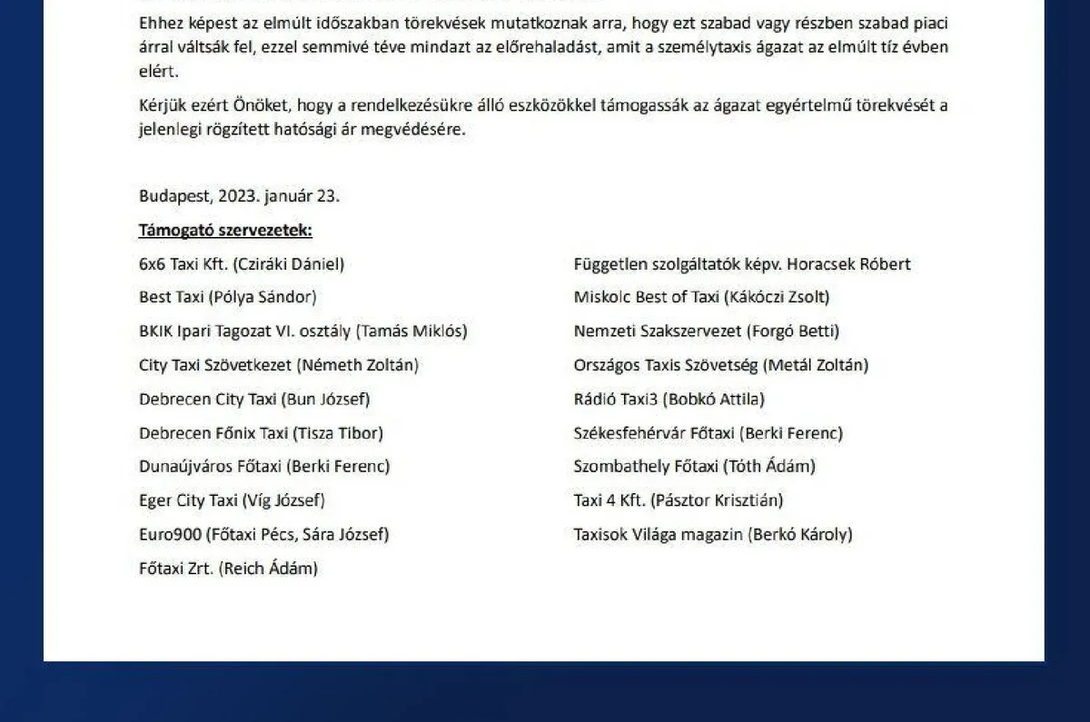 A kérés mögött ténylegesen valódi konszenzus látszik: a levelet mások mellett aláírta a 6x6 Taxi Kft., a Best Taxi, a BKIK, a City Taxi Szövetkezet, a Debrecen City Taxi, a Dunaújváros Főtaxi, a Főtaxi, a független szolgáltatók képviselője, azOrszágos Taxis Szövetség, a Taxi 4 Kft. és a Taxisok Világa magazin is.