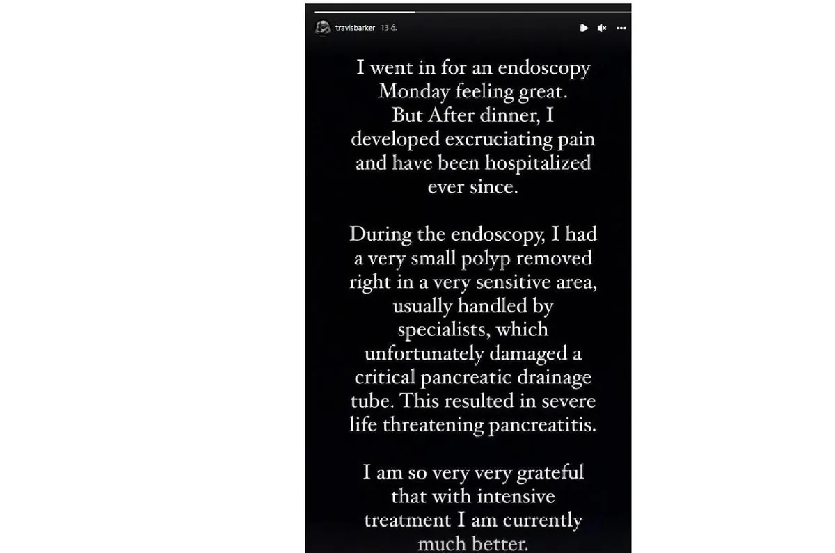 Instagram-sztorijában azt írja, hogy hétfőn endoszkópos vizsgálatot végeztek el rajta, mely során az orvosok a szervezetében találtak egy bélpolip, amit eltávolítottak. A beavatkozást követően hazaengedték, azonban vacsora után hasi fájdalmak kezdődtek nála. A fájdalmai később annyira felerősödtek, hogy kórházba kellett szállítani.